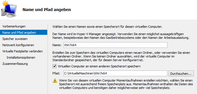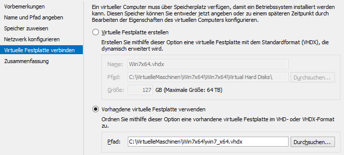 Neue virtuelle Maschine in Hyper-V mit vorhandener virtueller Festplatte anlegen