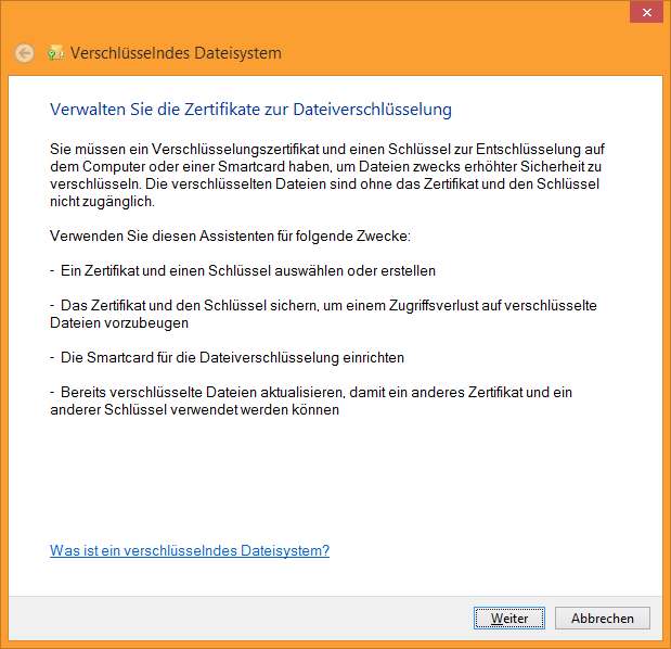 - Öffnen Sie in der Systemsteuerung den Assistenten ‚Dateiverschlüsselungszertifikate verwaleten‘