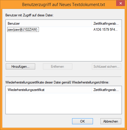 Ab sofort können Sie im Notfall mit der .pfx-Datei die verschlüsselten Daten sämtlicher Benutzer dieses Computers entschlüsseln, die ab diesem neu verschlüsselt oder einfach nur geöffnet wurden.