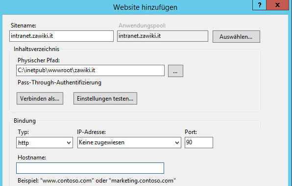 Möchten Sie einen Hostnamen als Bindung für die neue Site verwenden, muss anschließend noch ein CNAME-Eintrag in ihrer Forward-Lookupzone erstellt werden.