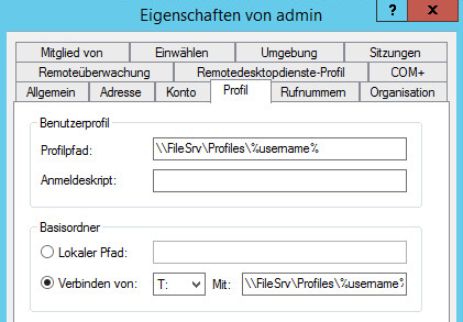 In der Konsole “Active Directory-Benutzer und -Computer” auf der Registerkarte Profil kann der Speicherort des Benutzerprofils sowie Einstellungen zum Basisordner festgelegt werden.