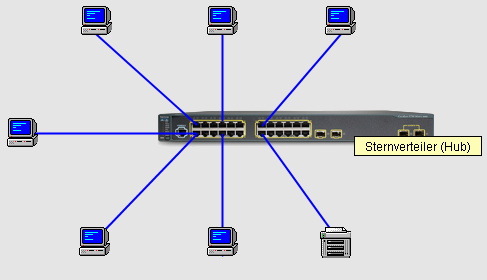 - Jeder Computer wird über ein Ethernetkabel mit dem Hub verbunden