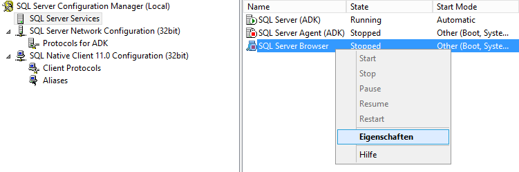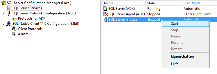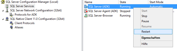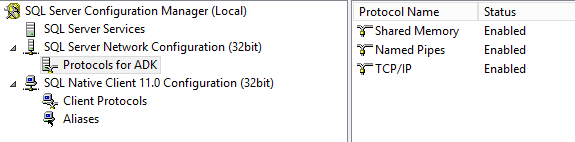 Unter dem Punkt „SQL Server Network Configuration“ –< Protocols for ADK: aktivieren !