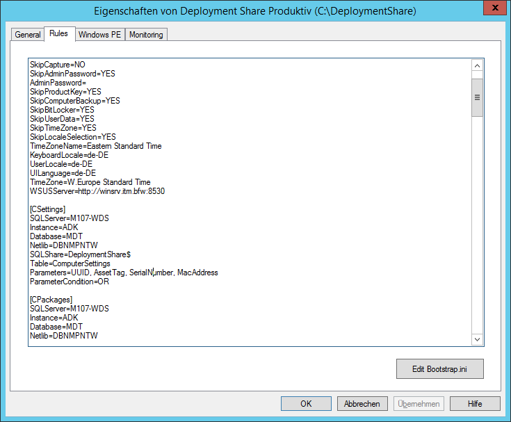 Bevor die Datenbank benutzt werden kann, muss die CustomSettings.ini konfiguriert werden: