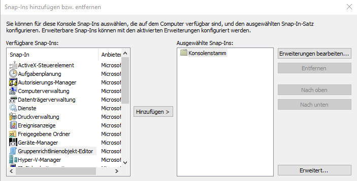 Starten Sie hierzu über die Powershell die MMC-Konsole (mmc.exe) und fügen Sie über Datei –> „Snap-In hinzufügen/entfernen“ den Gruppenrichtlinien-Editor hinzu:
