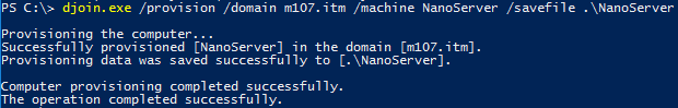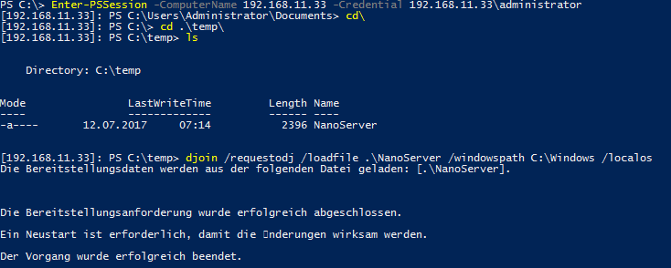 djoin.exe /provision /domain <Name der Domäne> /machine <Name des Servers> /savefile .\NanoServer |