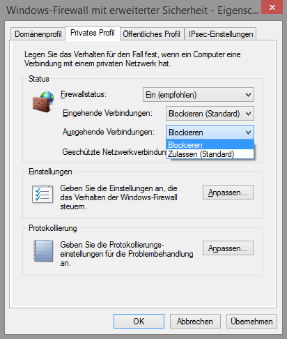 Wechseln hier, auf die Registerkarte ‚Privates Profil‘ und wählen die Option ‚Blockieren‘ für ‚Ausgehende Verbindungen‘