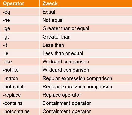 - In der Abbildung rechts, finden Sie einen Auszug von Operatoren aus der Powershell-Hilfe